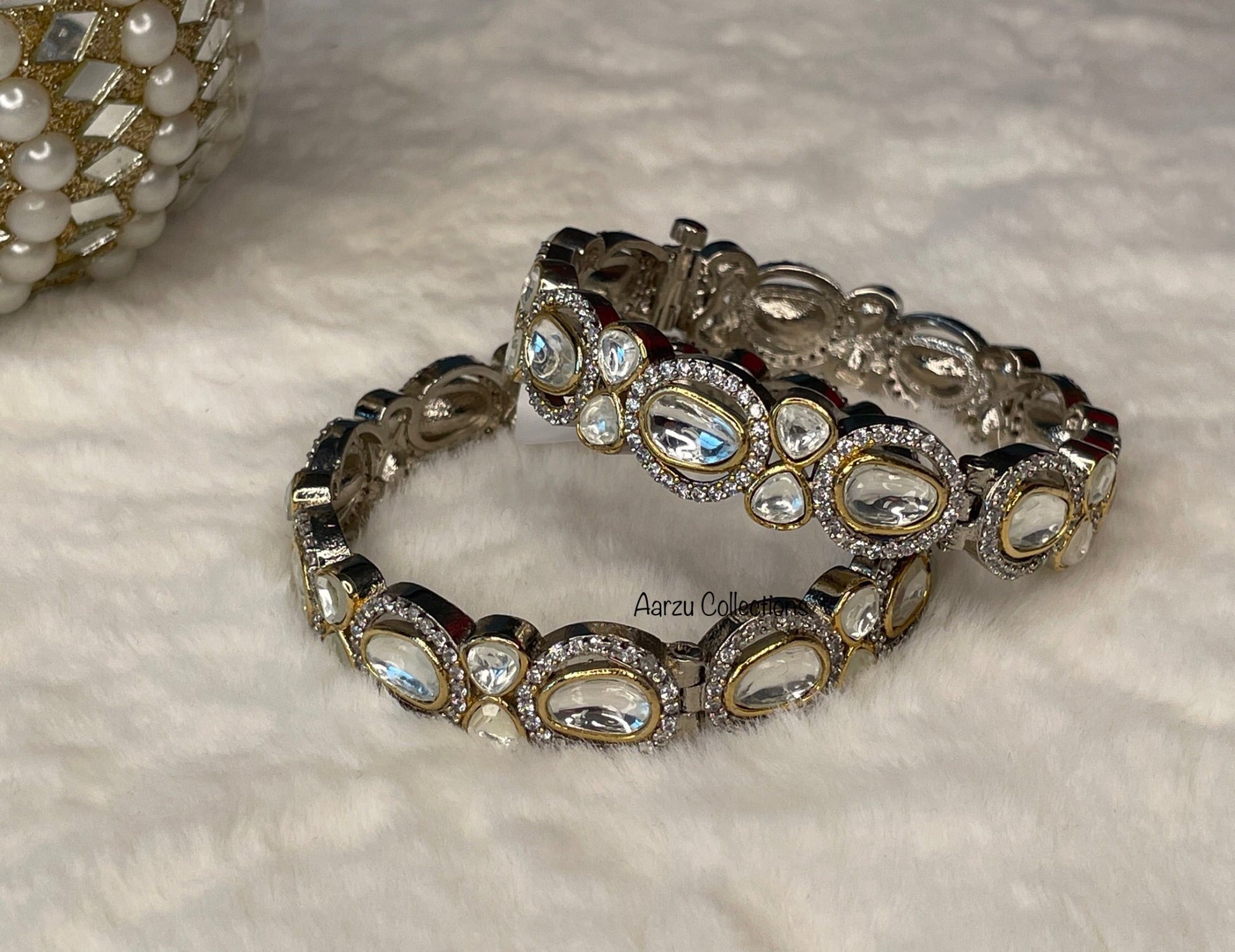Marudhara Polki Kundan and AD Openable Bangles Pair with Platinum finish.