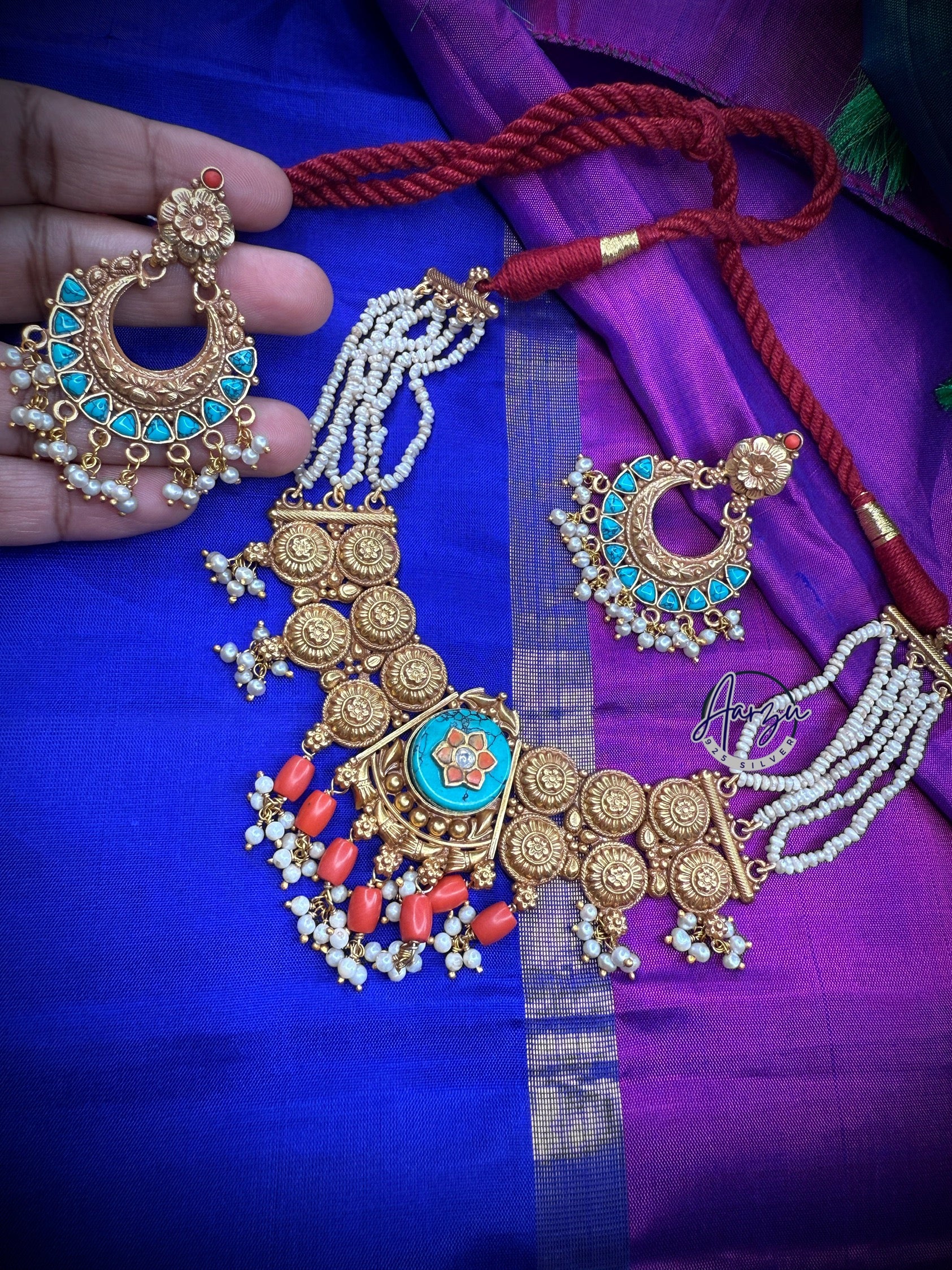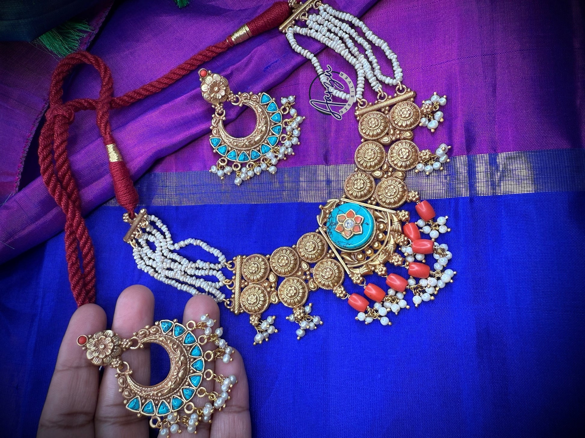 92.5 Silver base designer inspired necklace with coral and turquoise