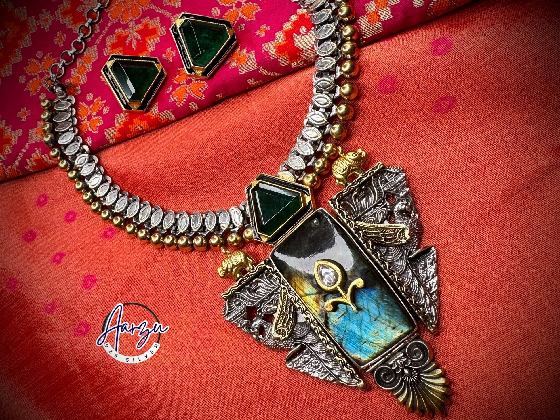 92.5 Silver base designer inspired necklace and green doublet with black enamel studs