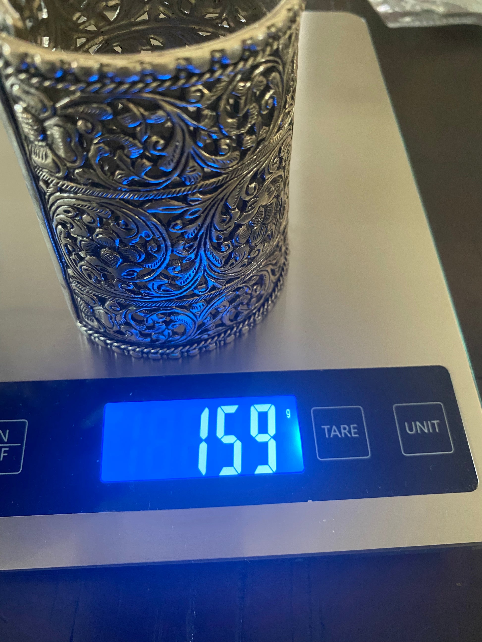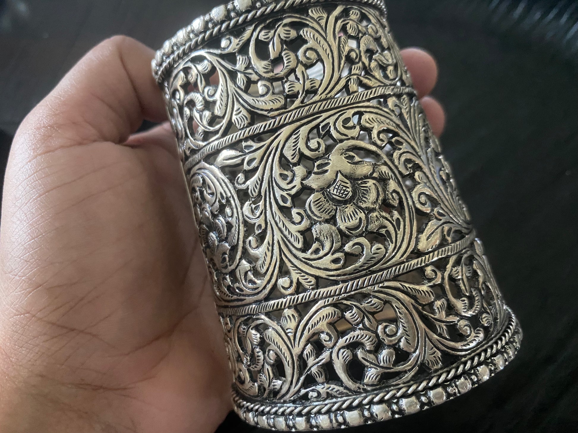 Handcrafted statement cuff in 92.5 sterling silver with Chitai carving work.
