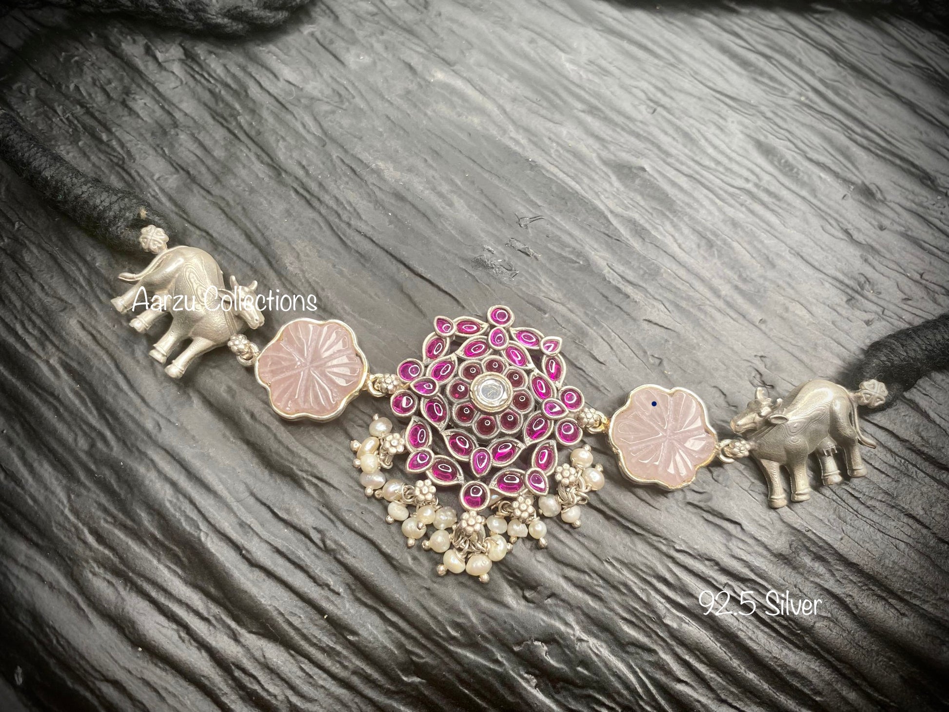 92.5 Silver Choker with rose quartz carved stone