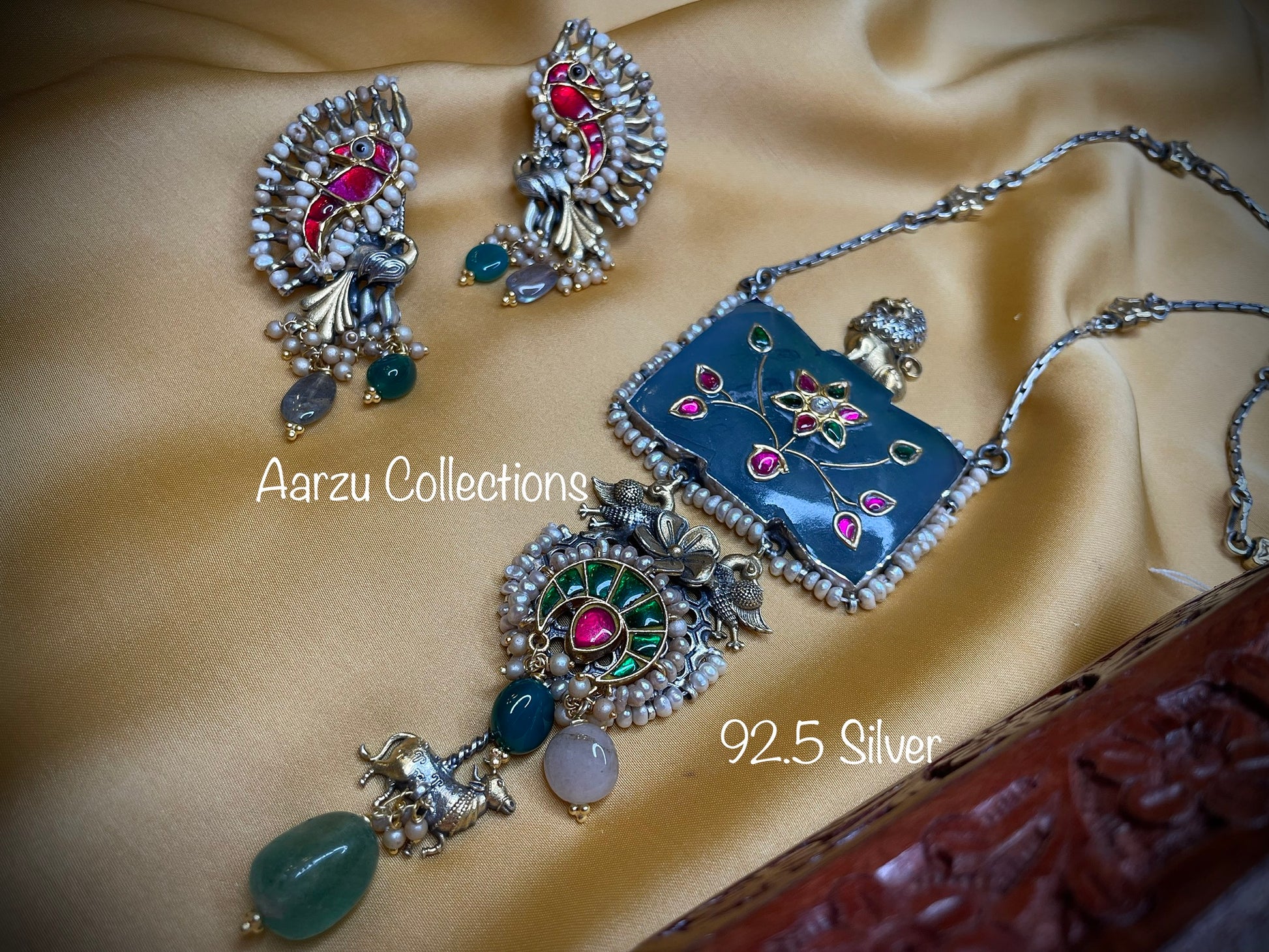 92.5 Silver Dual tone fusion necklace with earrings 130 gms