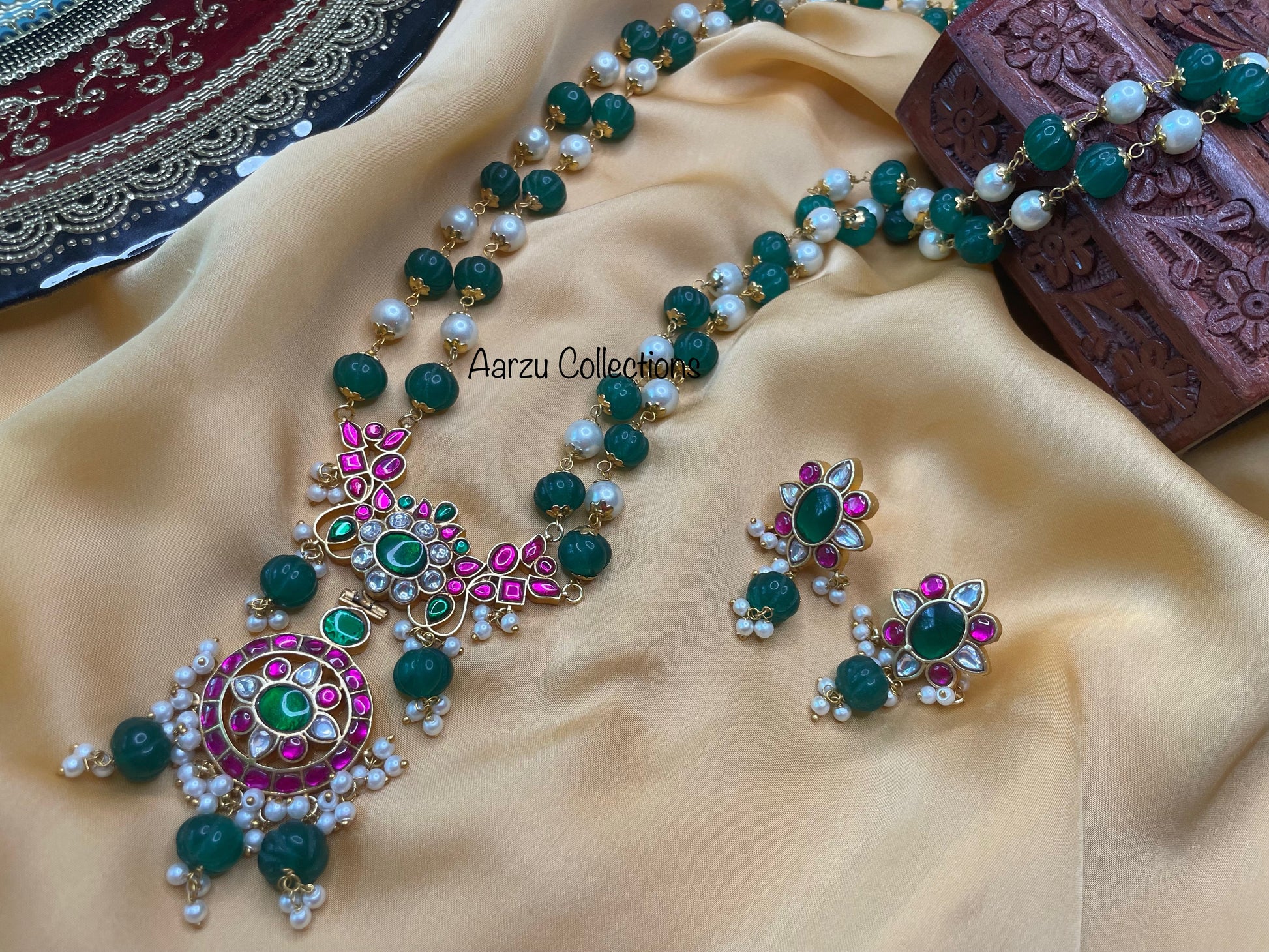 Jadau Kundan Pumpkin Bead Mala and Earrings Set