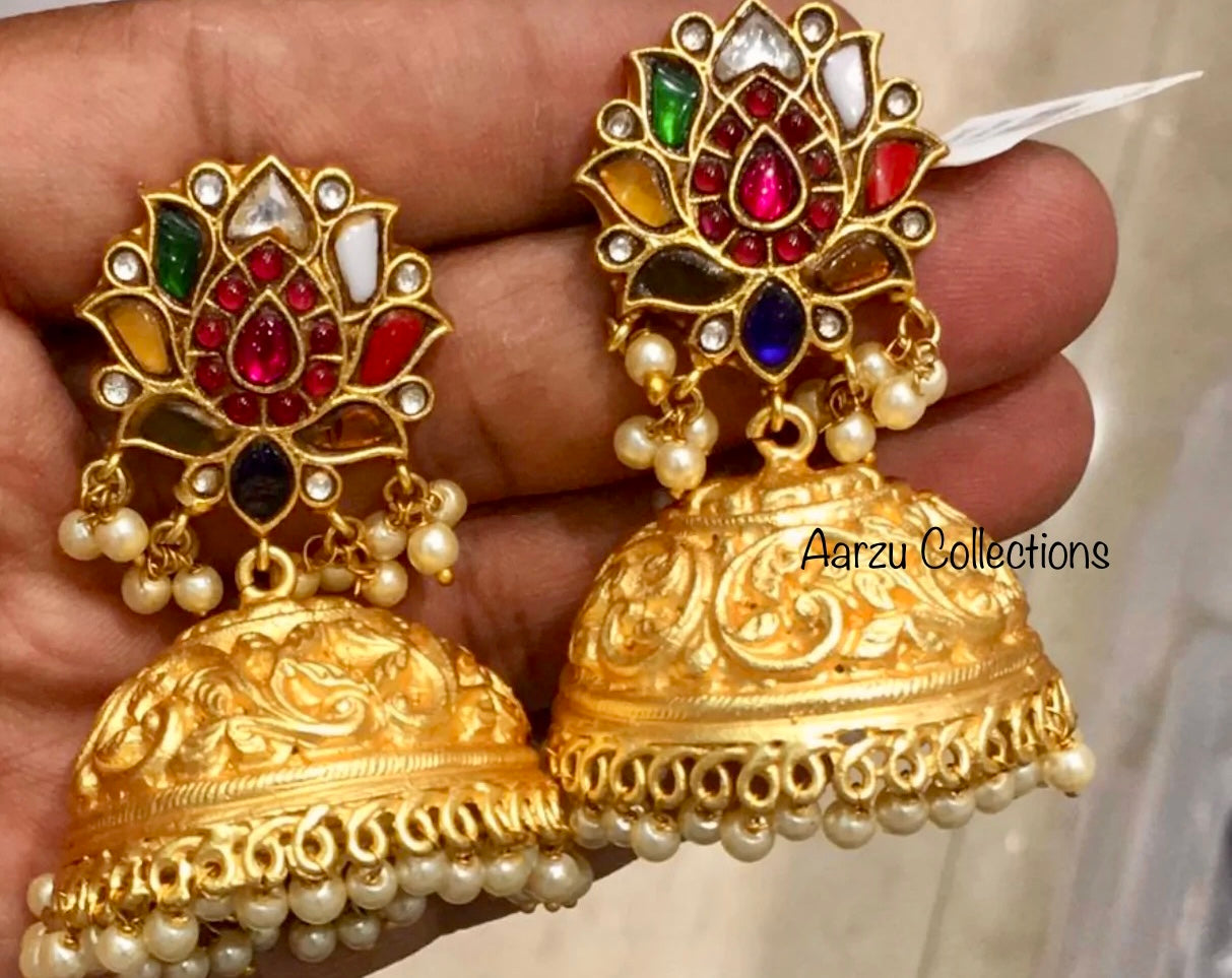 Kundan Jadau lotus Jhumkas - Navrathan/Multi
