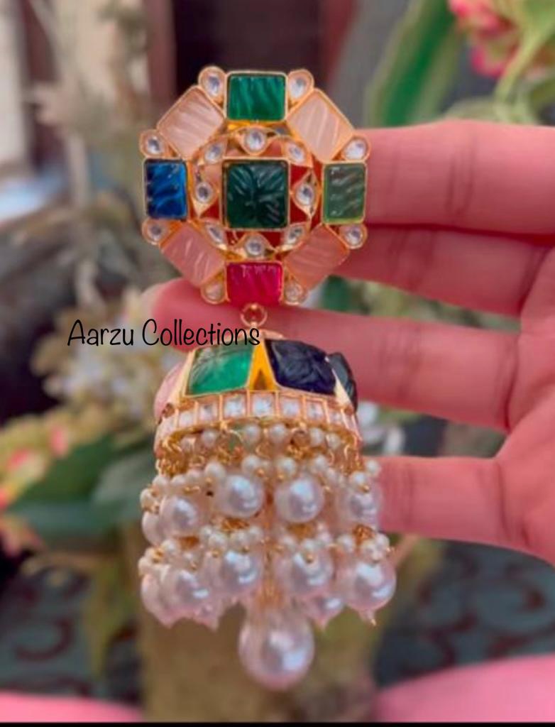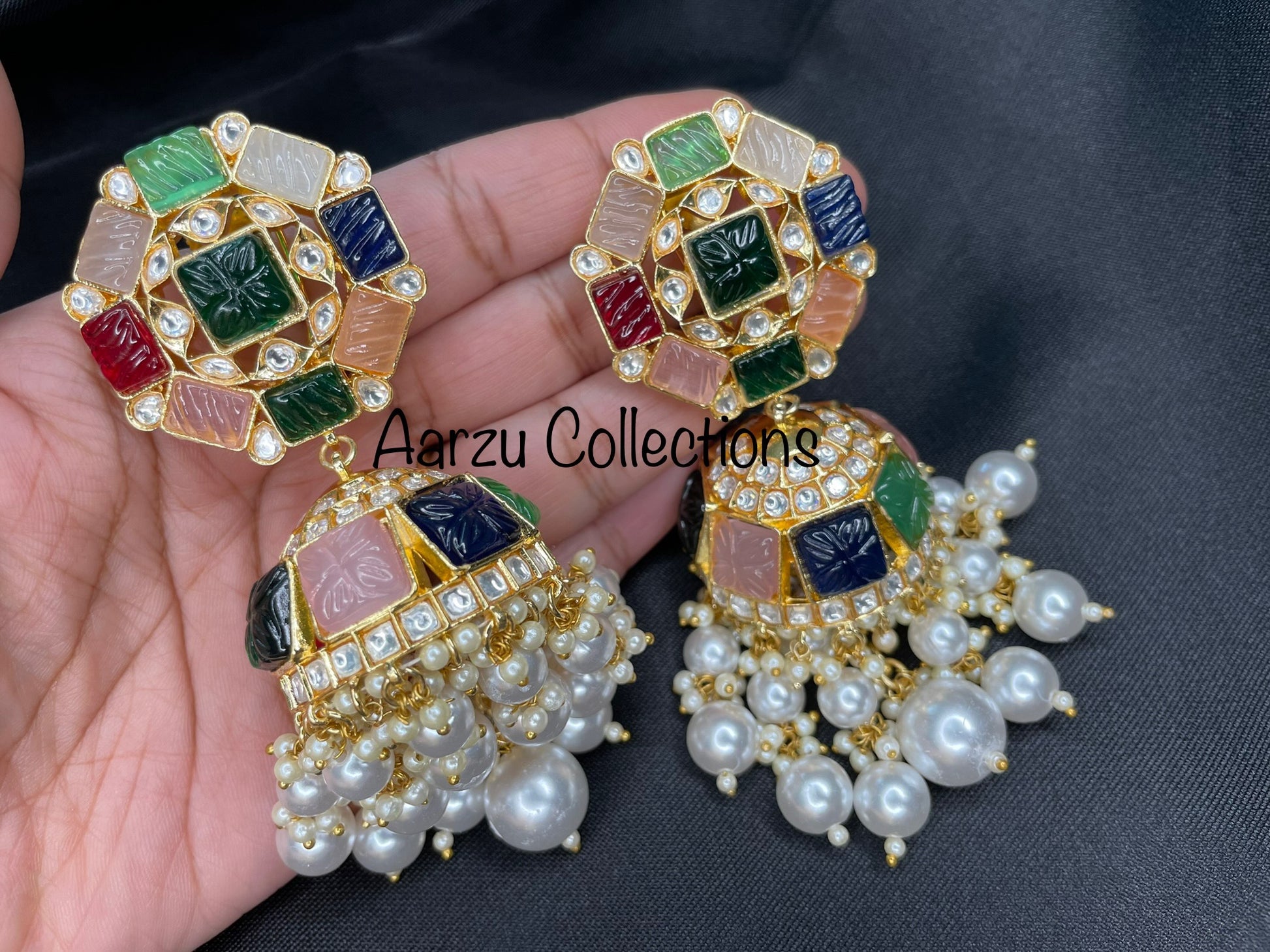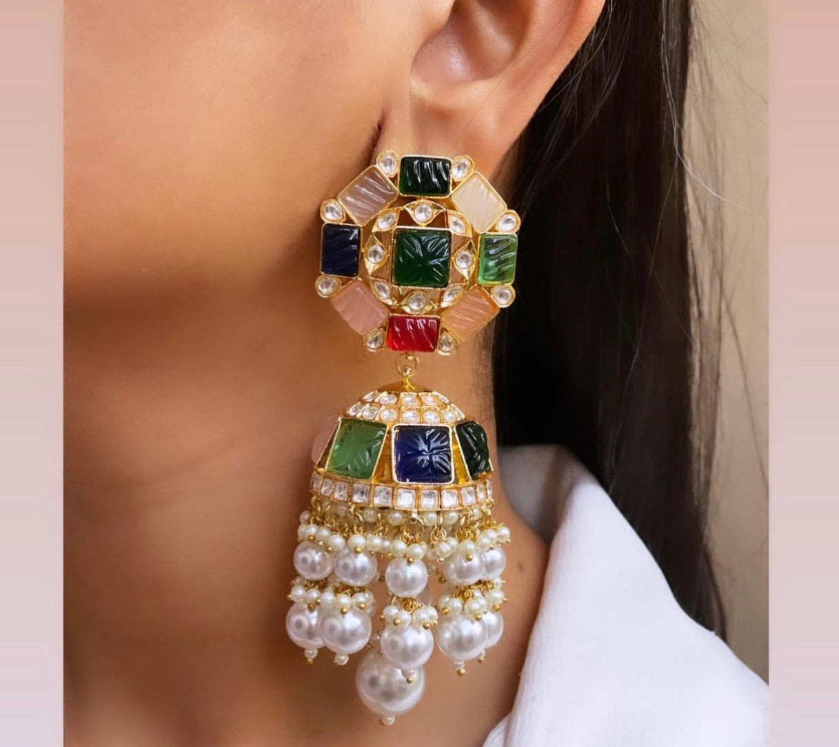 Silver foil Kundan and Carved Stone Statement Jhumka