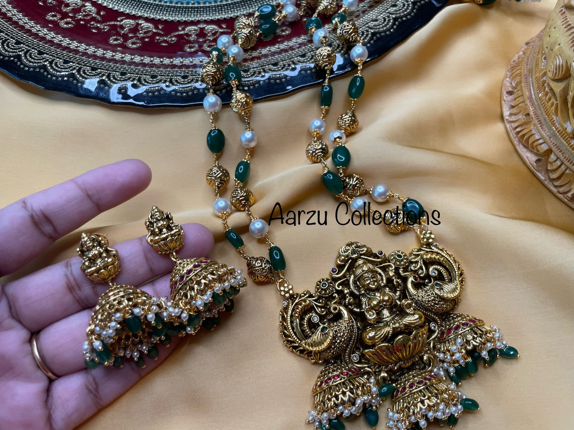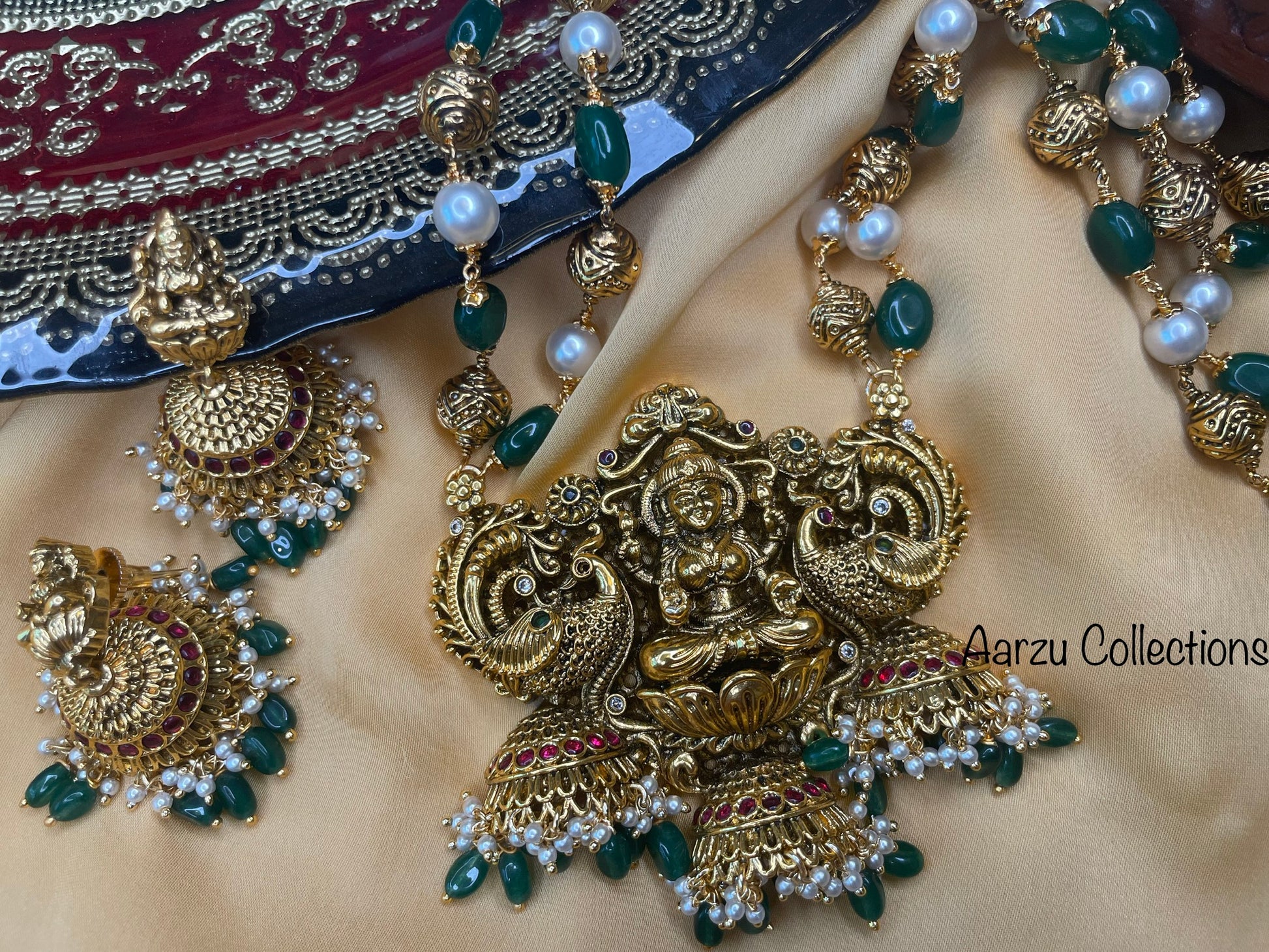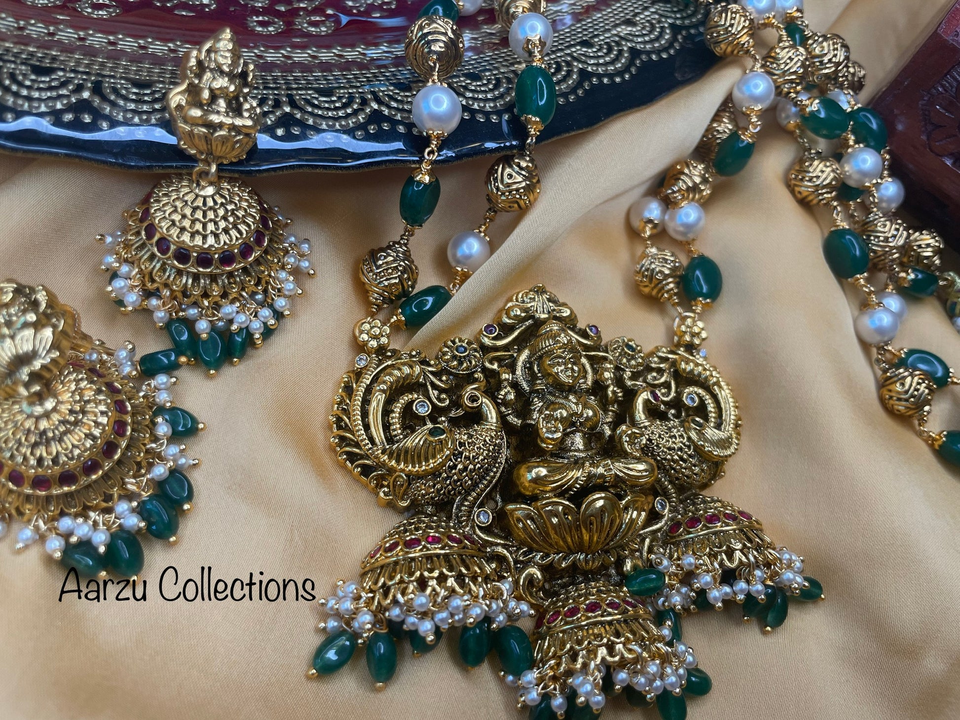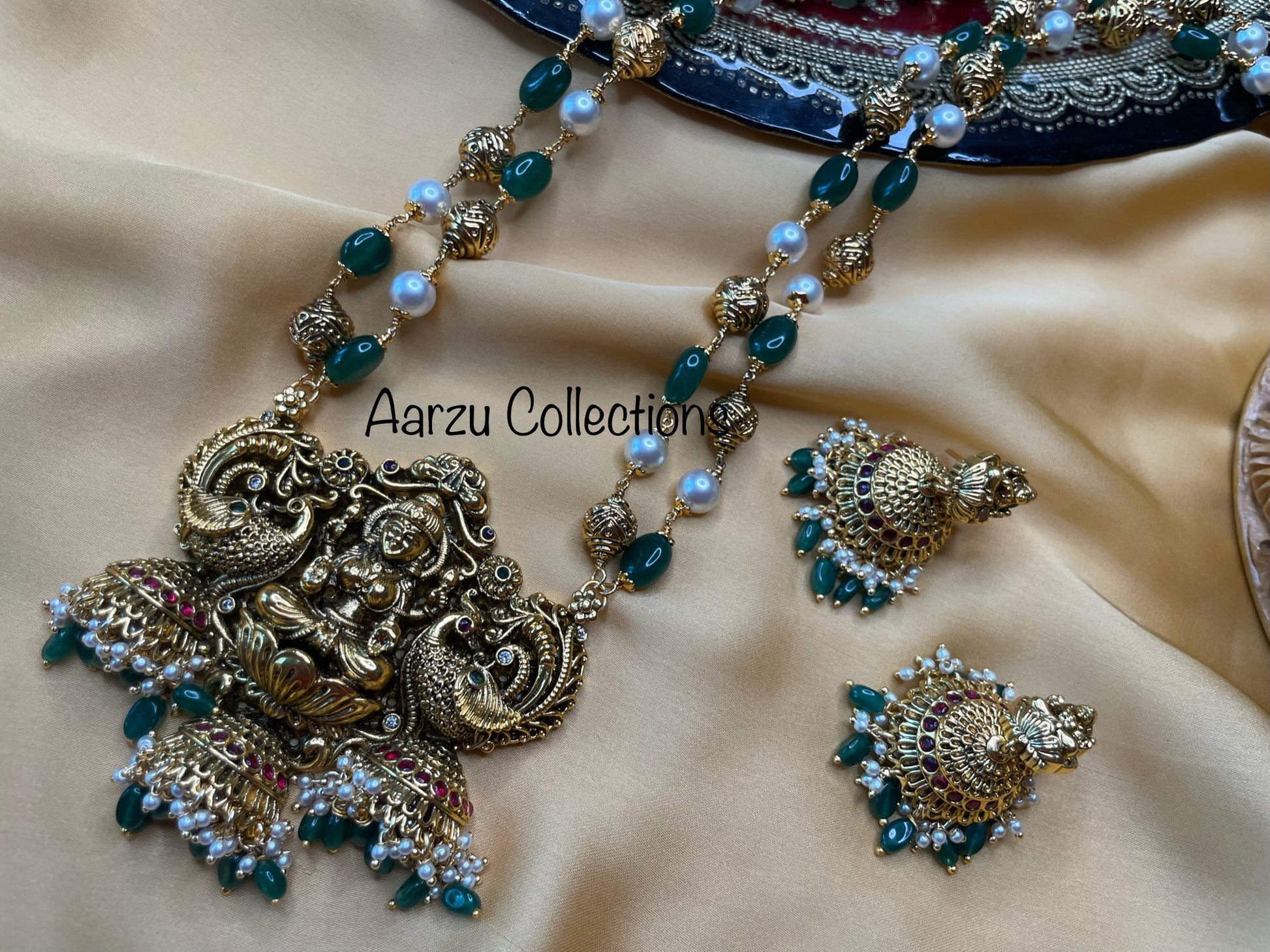 Premium Antique finish Temple Necklace Set with Beads and pearls